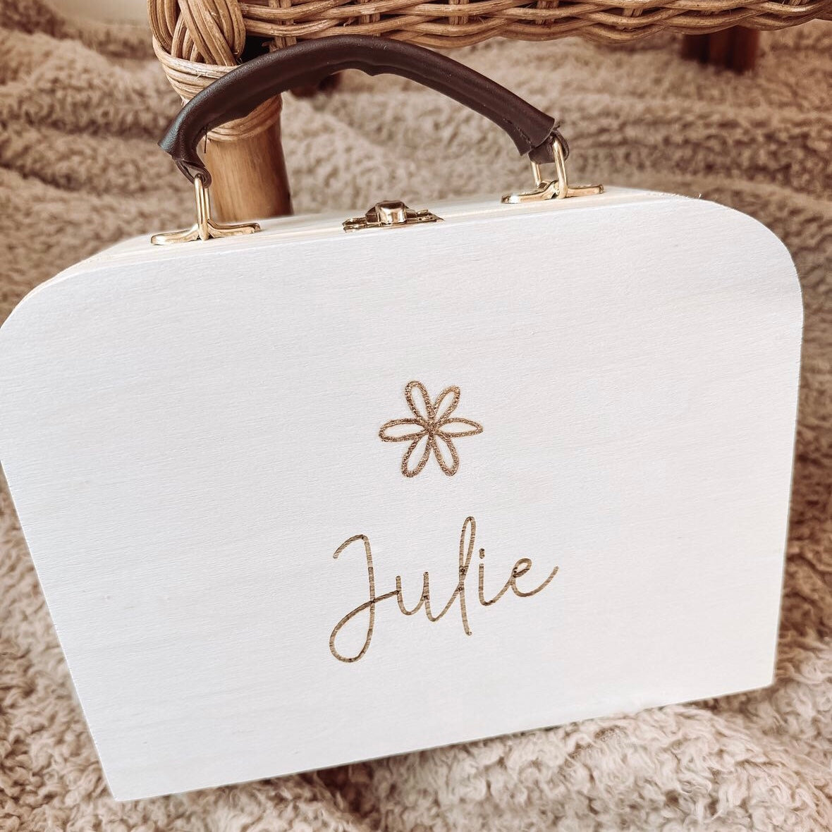 Met leren handvat en goudkleurig slotje. En een symbooltje naar keuze bedekt met goudfolie.